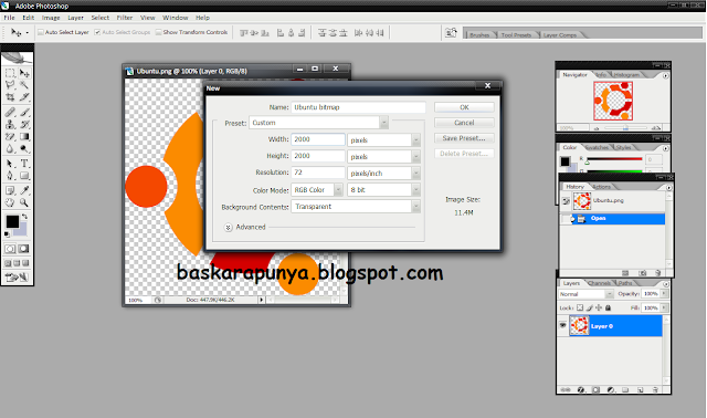 2. Buka Adobe Photoshop dan masukkan gambar tersebut kedalam program Adobe Photoshop, Lalu kita buat file baru dengan cara klik File-New, Ukuran yang Kita buat adalah 2000 pixels X 2000 pixels dengan background contents transparent, bisa dilihat gambar dibawah ini (Klik untuk perbesar Gambar).